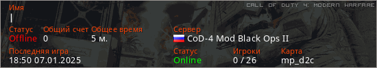 Играет на Call of Duty 4: Modern Warfare сервере. Страна: РоссияПервый раз замечен 18:44 07.01.2025