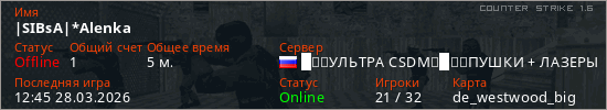 Играет на Counter Strike 1.6 сервере. Страна: РоссияПервый раз замечен 12:41 28.03.2026
