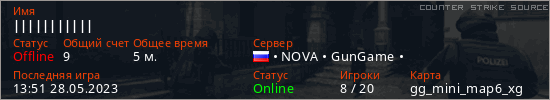 Играет на Counter Strike Source сервере. Страна: РоссияПервый раз замечен 13:35 28.05.2023