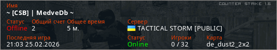 Играет на Counter Strike 1.6 сервере. Страна: УкраинаПервый раз замечен 20:55 25.02.2026