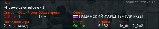 Играет на Counter Strike 1.6 сервере. Страна: РоссияПервый раз замечен 05:46 22.03.2026
