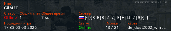 Играет на Counter Strike 1.6 сервере. Страна: РоссияПервый раз замечен 16:38 02.03.2026