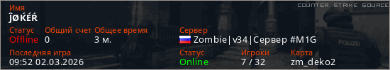 Играет на Counter Strike Source сервере. Страна: РоссияПервый раз замечен 09:52 02.03.2026