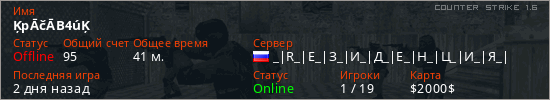 Играет на Counter Strike 1.6 сервере. Страна: РоссияПервый раз замечен 17:48 25.02.2026