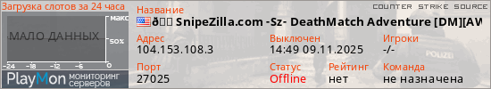 🌠SnipeZilla.com -Sz- DeathMatch Adventure [DM][AWP][ALL] представлен в виде сервера ксс. Из всех имеющихся на сайте модификаций игровых серверов, наша система поставила метку DeathMatch сервера css. В нашем мониторинге игровых серверов вы так же можете найти где поиграть на AWP сервере ксс.