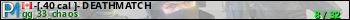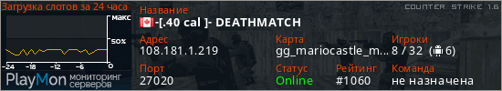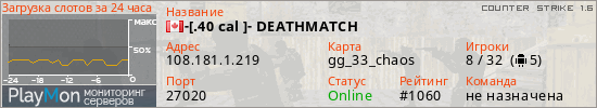 -[.40 cal ]- DEATHMATCH представлен в виде сервера кс 1.6. Из всех имеющихся на сайте модификаций игровых серверов, наша система поставила метку DeathMatch сервера cs. В нашем мониторинге игровых серверов вы так же можете найти быструю навигацию по всем меткам - используйте главную страницу игры Counter Strike 1.6.