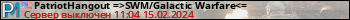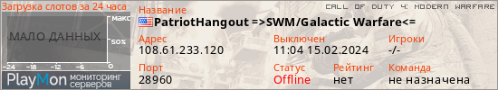 PatriotHangout =>SWM/Galactic Warfare<= представлен в виде сервера код 4. Из всех имеющихся на сайте модификаций игровых серверов, вам может понравиться Cracked серверы cod4. А для быстрой навигации по всем меткам - используйте главную страницу игры Call of Duty 4: Modern Warfare.