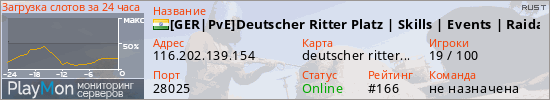 [GER|PvE]Deutscher Ritter Platz | Skills | Events | Raidable Ba представлен в виде сервера раст. Из всех имеющихся на сайте модификаций игровых серверов, наша система поставила метку PvE сервера rust. В нашем мониторинге игровых серверов вы так же можете найти быструю навигацию по всем меткам - используйте главную страницу игры Rust.