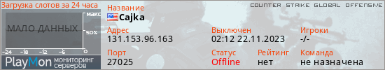 Общая информация ID: 53168 Ссылка: https://playmon.ru/server/131.153.96.163:27025 Адрес: 131.153.96.163:27025 Игроки: 0/4 Статус: Выключен Владелец: Не определён