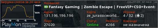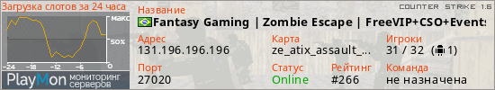 Fantasy Gaming | Zombie Escape | FreeVIP+CSO+Events представлен в виде сервера кс 1.6. Из всех имеющихся на сайте модификаций игровых серверов, наша система поставила метку Zombie сервера cs. В нашем мониторинге игровых серверов вы так же можете найти быструю навигацию по всем меткам - используйте главную страницу игры Counter Strike 1.6.