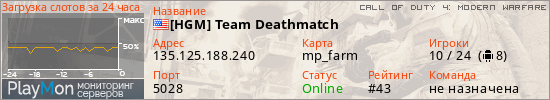 [HGM] Team Deathmatch представлен в виде сервера код 4. Из всех имеющихся на сайте модификаций игровых серверов, наша система поставила метку Deathmatch сервера cod4. В нашем мониторинге игровых серверов вы так же можете найти быструю навигацию по всем меткам - используйте главную страницу игры Call of Duty 4: Modern Warfare.