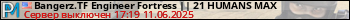 Bangerz.TF Engineer Fortress || 21 HUMANS MAX представлен в виде сервера ксс. Из всех имеющихся на сайте модификаций игровых серверов, вам может понравиться DeathRun серверы css. А для быстрой навигации по всем меткам - используйте главную страницу игры Counter Strike Source.