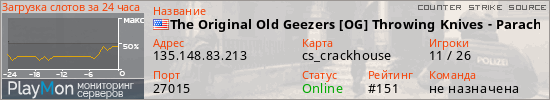 The Original Old Geezers [OG] Throwing Knives - Parachute - FF представлен в виде сервера ксс. Из всех имеющихся на сайте модификаций игровых серверов, вам может понравиться DeathRun серверы css. А для быстрой навигации по всем меткам - используйте главную страницу игры Counter Strike Source.