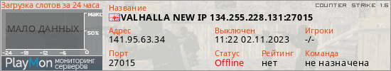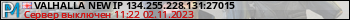 VALHALLA NEW IP 134.255.228.131:27015 представлен в виде сервера кс 1.6. Из всех имеющихся на сайте модификаций игровых серверов, вам может понравиться Knife серверы cs. А для быстрой навигации по всем меткам - используйте главную страницу игры Counter Strike 1.6.