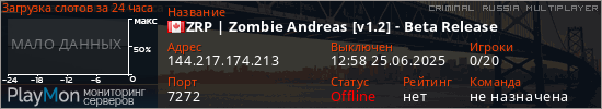 Общая информация ID: 66000 Ссылка: https://playmon.ru/server/144.217.174.213:7272 Версия: 0.3.7-R2 Адрес: 144.217.174.213:7272 Игроки: 0/20 Статус: Выключен Владелец: Не определён