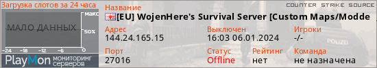 [EU] WojenHere's Survival Server [Custom Maps/Modded] представлен в виде сервера ксс. Из всех имеющихся на сайте модификаций игровых серверов, вам может понравиться GunGame серверы css. А для быстрой навигации по всем меткам - используйте главную страницу игры Counter Strike Source.