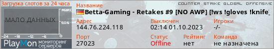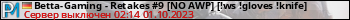 Betta-Gaming - Retakes #9 [NO AWP] [!ws !gloves !knife] представлен в виде сервера кс го. Из всех имеющихся на сайте модификаций игровых серверов, наша система поставила метку Retake сервера csgo. В нашем мониторинге игровых серверов вы так же можете найти где поиграть на AWP сервере кс го.