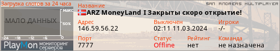 Общая информация ID: 61319 Ссылка: https://playmon.ru/server/146.59.56.22:7777 Версия: 0.3.7-R2 Адрес: 146.59.56.22:7777 Игроки: 0/110 Статус: Выключен Владелец: Не определён