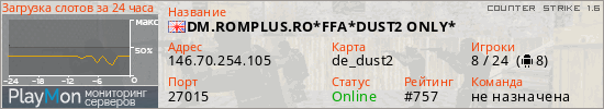 DM.ROMPLUS.RO*FFA*DUST2 ONLY* представлен в виде сервера кс 1.6. Из всех имеющихся на сайте модификаций игровых серверов, наша система поставила метку DeathMatch сервера cs. В нашем мониторинге игровых серверов вы так же можете найти где поиграть на FFA сервере кс 1.6.