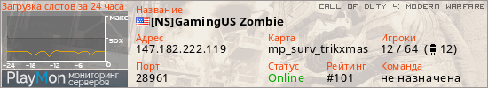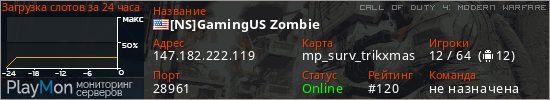 [NS]GamingUS Zombie представлен в виде сервера код 4. Из всех имеющихся на сайте модификаций игровых серверов, наша система поставила метку Zombies сервера cod4. В нашем мониторинге игровых серверов вы так же можете найти быструю навигацию по всем меткам - используйте главную страницу игры Call of Duty 4: Modern Warfare.
