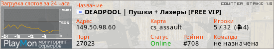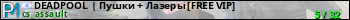 DEADPOOL | Пушки + Лазеры [FREE VIP] представлен в виде сервера кс 1.6. Из всех имеющихся на сайте модификаций игровых серверов, наша система поставила метку Пушки + Лазеры сервера cs. В нашем мониторинге игровых серверов вы так же можете найти быструю навигацию по всем меткам - используйте главную страницу игры Counter Strike 1.6.