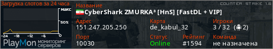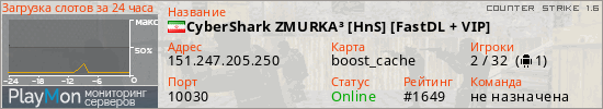 CyberShark ZMURKA³ [HnS] [FastDL + VIP] представлен в виде сервера кс 1.6. Из всех имеющихся на сайте модификаций игровых серверов, наша система поставила метку Hide'n'Seek сервера cs. В нашем мониторинге игровых серверов вы так же можете найти быструю навигацию по всем меткам - используйте главную страницу игры Counter Strike 1.6.