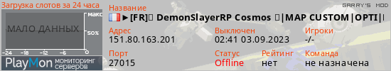 Общая информация ID: 56016 Ссылка: https://playmon.ru/server/151.80.163.201:27015 Адрес: 151.80.163.201:27015 Игроки: 0/64 Статус: Выключен Владелец: Не определён