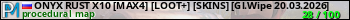 ONYX RUST X10 [MAX4] [LOOT+] [SKINS] [Gl.Wipe 20.03.2026] представлен в виде сервера раст. Из всех имеющихся на сайте модификаций игровых серверов, наша система поставила метку Loot сервера rust. В нашем мониторинге игровых серверов вы так же можете найти быструю навигацию по всем меткам - используйте главную страницу игры Rust.