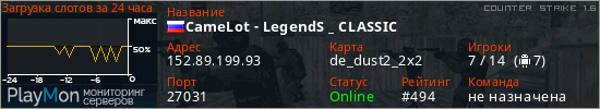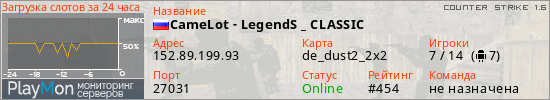 CameLot - LegendS _ CLASSIC представлен в виде сервера кс 1.6. Из всех имеющихся на сайте модификаций игровых серверов, наша система поставила метку Classic сервера cs. В нашем мониторинге игровых серверов вы так же можете найти быструю навигацию по всем меткам - используйте главную страницу игры Counter Strike 1.6.