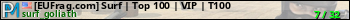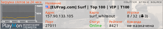 [EUFrag.com] Surf | Top 100 | VIP | T100 представлен в виде сервера ксс. Из всех имеющихся на сайте модификаций игровых серверов, наша система поставила метку Surf сервера css. В нашем мониторинге игровых серверов вы так же можете найти быструю навигацию по всем меткам - используйте главную страницу игры Counter Strike Source.