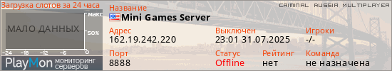 Общая информация ID: 65924 Ссылка: https://playmon.ru/server/162.19.242.220:8888 Версия: 1.4.0.2783 Адрес: 162.19.242.220:8888 Игроки: 0/30 Статус: Выключен Владелец: Не определён