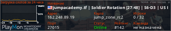jumpacademy.tf | Soldier Rotation [13:38] | S3-D1 | US East представлен в виде сервера тф2. Из всех имеющихся на сайте модификаций игровых серверов, наша система поставила метку Jump сервера tf2. В нашем мониторинге игровых серверов вы так же можете найти быструю навигацию по всем меткам - используйте главную страницу игры Team Fortress 2.