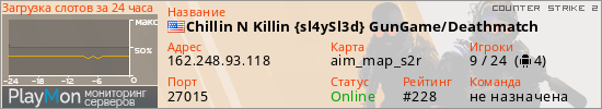 Chillin N Killin {sl4ySl3d} GunGame/Deathmatch представлен в виде сервера кс 2. Из всех имеющихся на сайте модификаций игровых серверов, наша система поставила метку GunGame сервера cs2. В нашем мониторинге игровых серверов вы так же можете найти где поиграть на DeathMatch сервере кс 2.