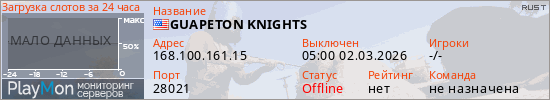 GUAPETON KNIGHTS представлен в виде сервера раст. Из всех имеющихся на сайте модификаций игровых серверов, вам может понравиться NoDecay серверы rust. А для быстрой навигации по всем меткам - используйте главную страницу игры Rust.