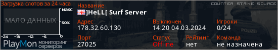 ]HeLL[ Surf Server представлен в виде сервера ксс. Из всех имеющихся на сайте модификаций игровых серверов, наша система поставила метку Surf сервера css. В нашем мониторинге игровых серверов вы так же можете найти быструю навигацию по всем меткам - используйте главную страницу игры Counter Strike Source.