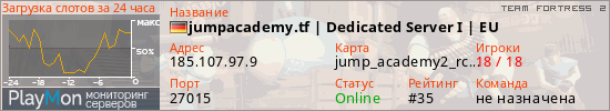 jumpacademy.tf | Dedicated Server I | EU представлен в виде сервера тф2. Из всех имеющихся на сайте модификаций игровых серверов, наша система поставила метку Jump сервера tf2. В нашем мониторинге игровых серверов вы так же можете найти быструю навигацию по всем меткам - используйте главную страницу игры Team Fortress 2.