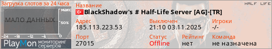 Общая информация ID: 67474 Ссылка: https://playmon.ru/server/185.113.223.53:27015 Адрес: 185.113.223.53:27015 Игроки: 0/12 Статус: Выключен Владелец: Не определён