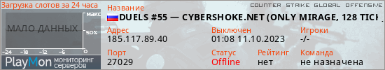 DUELS #55 — CYBERSHOKE.NET (ONLY MIRAGE, 128 TICK) представлен в виде сервера кс го. Из всех имеющихся на сайте модификаций игровых серверов, вам может понравиться Knife серверы csgo. А для быстрой навигации по всем меткам - используйте главную страницу игры Counter Strike Global Offensive.