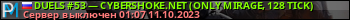 DUELS #53 — CYBERSHOKE.NET (ONLY MIRAGE, 128 TICK) представлен в виде сервера кс го. Из всех имеющихся на сайте модификаций игровых серверов, вам может понравиться Knife серверы csgo. А для быстрой навигации по всем меткам - используйте главную страницу игры Counter Strike Global Offensive.