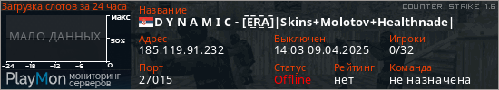 D Y N A M I C - [̅E̲̅R̲̅A̲̲̅]|Skins+Molotov+Healthnade| представлен в виде сервера кс 1.6. Из всех имеющихся на сайте модификаций игровых серверов, вам может понравиться Knife серверы cs. А для быстрой навигации по всем меткам - используйте главную страницу игры Counter Strike 1.6.
