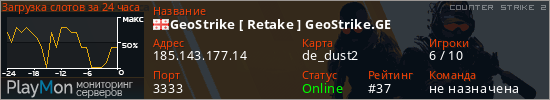 GeoStrike [ Retake ] GeoStrike.GE представлен в виде сервера кс 2. Из всех имеющихся на сайте модификаций игровых серверов, наша система поставила метку Retake сервера cs2. В нашем мониторинге игровых серверов вы так же можете найти быструю навигацию по всем меткам - используйте главную страницу игры Counter Strike 2.