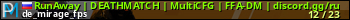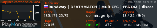 RunAway | DEATHMATCH | MultiCFG | FFA-DM | discord.gg/runaway представлен в виде сервера кс 2. Из всех имеющихся на сайте модификаций игровых серверов, наша система поставила метку DeathMatch сервера cs2. В нашем мониторинге игровых серверов вы так же можете найти где поиграть на FFA сервере кс 2.
