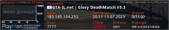 Общая информация ID: 65803 Ссылка: https://playmon.ru/server/185.185.134.252:7777 Версия: 0.3.7-R2 Адрес: 185.185.134.252:7777 Игроки: 0/1000 Статус: Выключен Владелец: Не определён