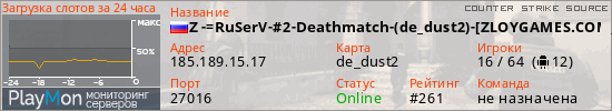 Z -=RuSerV-#2-Deathmatch-(de_dust2)-[ZLOYGAMES.COM]=- представлен в виде сервера ксс. Из всех имеющихся на сайте модификаций игровых серверов, наша система поставила метку DeathMatch сервера css. В нашем мониторинге игровых серверов вы так же можете найти быструю навигацию по всем меткам - используйте главную страницу игры Counter Strike Source.