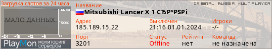 Общая информация ID: 61821 Ссылка: https://playmon.ru/server/185.189.15.22:3201 Версия: 0.3.7-R2 Адрес: 185.189.15.22:3201 Игроки: 0/1000 Статус: Выключен Владелец: Не определён
