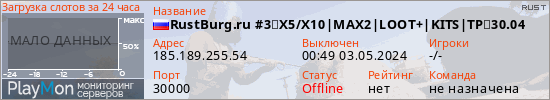 RustBurg.ru #3〔X5/X10|MAX2|LOOT+|KITS|TP〕30.04 представлен в виде сервера раст. Из всех имеющихся на сайте модификаций игровых серверов, наша система поставила метку Kits сервера rust. В нашем мониторинге игровых серверов вы так же можете найти где поиграть на Loot сервере раст.