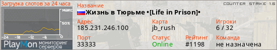 Жизнь в Тюрьме •[Life in Prison]• представлен в виде сервера кс 1.6. Из всех имеющихся на сайте модификаций игровых серверов, наша система поставила метку JailBreak сервера cs. В нашем мониторинге игровых серверов вы так же можете найти быструю навигацию по всем меткам - используйте главную страницу игры Counter Strike 1.6.