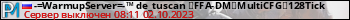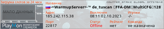 -=WarmupServer=-™ de_tuscan ★FFA-DM★MultiCFG★128Tick представлен в виде сервера кс го. Из всех имеющихся на сайте модификаций игровых серверов, наша система поставила метку DeathMatch сервера csgo. В нашем мониторинге игровых серверов вы так же можете найти где поиграть на FFA сервере кс го.