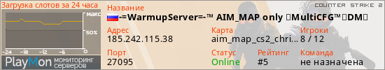 -=WarmupServer=-™ AIM_MAP only ★MultiCFG™★DM★ представлен в виде сервера кс 2. Из всех имеющихся на сайте модификаций игровых серверов, наша система поставила метку DeathMatch сервера cs2. В нашем мониторинге игровых серверов вы так же можете найти где поиграть на AIM сервере кс 2.