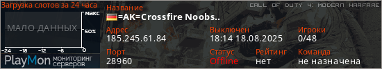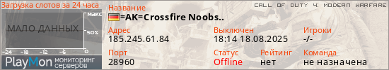 Общая информация ID: 66621 Ссылка: https://playmon.ru/server/185.245.61.84:28960 Адрес: 185.245.61.84:28960 Игроки: 0/48 Статус: Выключен Владелец: Не определён